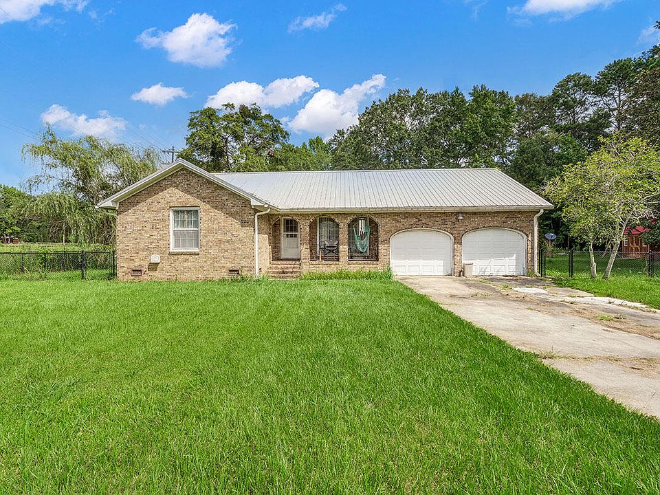 This solid brick home sitting on over an acre is ready to welcome you home! Lush grass and mature trees greet you as you pull up the long driveway and walk up to your front porch adorned with charming arches. Upon entering you will find a generous sized family room featuring a large front window and a ceiling fan! Your new kitchen boasts stunning wood floors, an abundance of cherry cabinets and a window over the sink, looking out into your backyard. A cozy den/family room features charming wood beams on the ceiling and a brick fireplace. 4 spacious bedrooms ensure plenty of room for family or guests! The large backyard is the perfect spot for weekend BBQs, pets or gardening. With no HOA and no restrictions you can turn this yard into your backyard oasis! A shed conveys for outdoor storage.A metal roof and leaf filter gutters save time on exterior maintenance and a fairly new AC unit will keep you cool in the summer. Conveniently located to all the shopping and dining that Summerville has to offer!