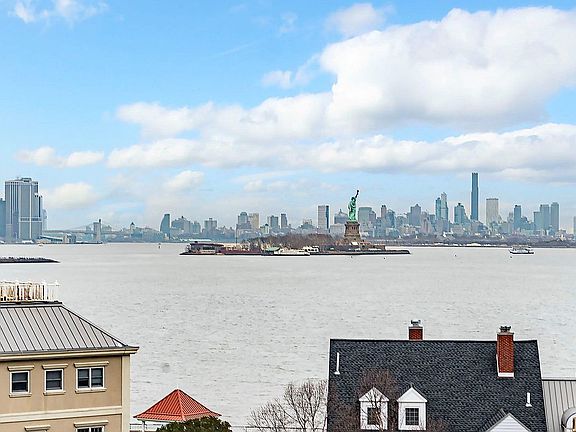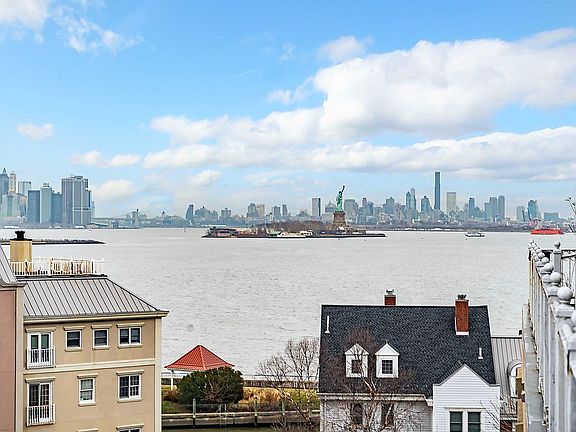 Breathtaking views of the Manhattan Skyline, Hudson River and Statue of Liberty and beyond define this sixth floor Penthouse. This duplex in Port Liberte is over 1900 sf with three bedrooms and 2 and one half baths. Classic elegance with formal entryway into a grand style living/dining room. Cathedral ceilings with newly installed greige toned modern flooring and French doors to your private balcony. Warm your winter nights with the wood burning fireplace. Open kitchen with timeless appeal. White cabinetry with stainless steel trim, all stainless appliances, marble backsplash and hanging pendant lights over the breakfast bar. Counters open into the dining space for ease of entertaining. The renovated powder room offers solid limestone sink with tumbled marble walls. Upgraded, interior staircase with stainless steel railings and grey stained steps complement the flooring. This upside-down Penthouse offers three generously outfitted bedrooms. The primary bedroom will accommodate any sized furnishings. Re-designed closet with floor to ceiling custom shelving. The primary bath is your spot to relax and wash away the days’ stresses. The step into whirlpool bath is generous in size and is along side of the frameless oversized shower with seating area. The two guest bedrooms share a common hallway bath. Guest bath also has been renovated with slate tile walls and floor. Full size laundry room with cupboards and newly installed C/A/C within the home. Other features include garage parking and full Port Liberte amenity package including 24 hour Gatehouse Security, professional style fitness facility, two outdoor pools, tennis courts, basketball court, tranquil green spaces, outdoor play area, fenced dog run and idyllic waterfront promenades. Easy NYC commute via on-site high speed ferry or on-site Shuttle to the Grove St PATH. Just minutes to all major highways and Newark Liberty Airport.