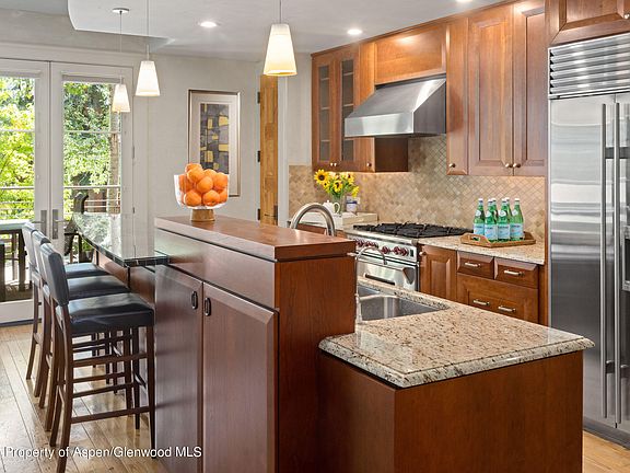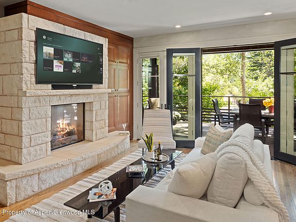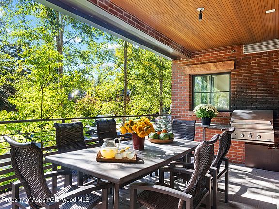 No exaggeration, this 3-bedroom flat is one of the very nicest in Aspen's core. Spend even a few moments here, and you'll sense how serene and special it is. One of 202's best features is a huge east-facing deck which sits among the trees, furnished w/ table and 6 chairs for dining, lounging/reading, listening to the birds. Built-in gas BBQ and hose hookup for your flower pots; snow-melted tiled floor. Enjoy the breeze and filtered sunlight all morning long. Spacious, open floorplan w/ tall windows, high ceilings, wood plank floors in the great room and kitchen, gas limestone block fireplace, and gorgeous kitchen with cherry cabinetry, granite counters, and stainless appliances including a Sub-Zero wine cooler and Wolf 6-burner gas range. Radiantly heated; central A/C. Each bedroom iscarpeted and includes its own tiled bath. Primary bath has double vanity, jetted tub, steam shower, and large walk-in closet. Powder room. Large laundry room with Miele washer and dryer. Private and secure building - only one other condo on this floor. Elevator access to street and to private 2-car garage w/ extra storage for a scooter, bikes, ski equipment, opposite-season clothing. Easy walk to bus stop and Rio Grande Trail; 3 blocks to Aspen Art Museum and 5 blocks to gondola. HOA expertly managed by Frias. Barstools and patio furniture included. TVs excluded. Other furnishings available separately from Aspen Home Staging. carpeted and includes its own tiled bath. Primary bath has double vanity, jetted tub, steam shower, and large walk-in closet. Powder room. Large laundry room with Miele washer and dryer. Private and secure building - only one other condo on this floor. Elevator access to street and to private 2-car garage w/ extra storage for a scooter, bikes, ski equipment, opposite-season clothing. Easy walk to bus stop and Rio Grande Trail; 3 blocks to Aspen Art Museum and 5 blocks to gondola. HOA expertly managed by Frias. Barstools and patio furniture included. TVs excluded. Other furnishings available separately from Aspen Home Staging.