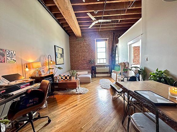 Exposed brickCorner unitPrivate bedroomLarge open living spaceStainless steel appliancesButcher block countertopsSleep storage loft