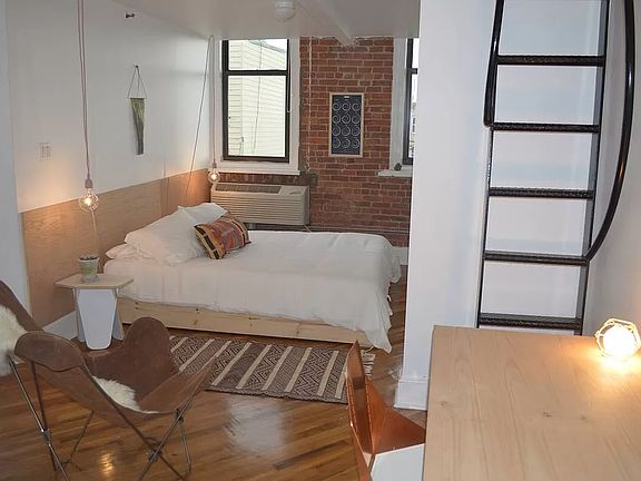 Large studio loft in converted Cork Factory! This spacious loft features a separate eat in kitchen just off the entrance. The kitchen features butcher block counters and subway tile back splash, plenty of cabinet space, and stainless steel appliances including dishwasher! Versatile floor plan with 2 large windows a nd open floor plan but can easily fit a large desk as show in photos, a lunge chair or chaise and sofa or large bed. There is a lofted sleep / storage area above accessible by ladder. Ample closet space throughout. Large bathroom with stand up shower. Gorgeous details through out. Building has a freight elevator and laundry in the basement.
