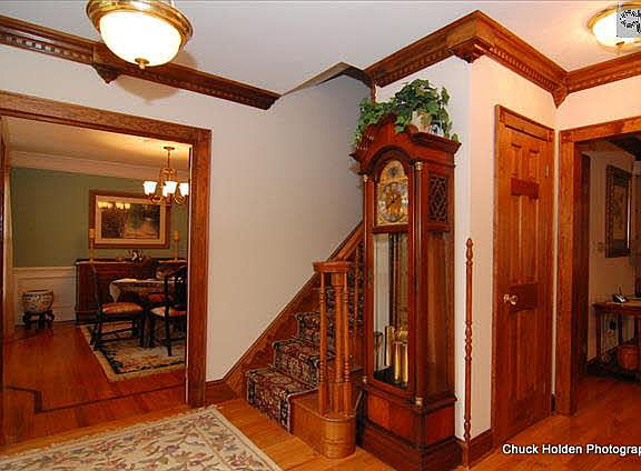 Custom built traditional home features beautiful hardwood floors, wood molding and solid wood doors. Spacious foyer flanked by formal living, dining set off by French doors and open staircase. Family room is sure to be a popular gathering spot with natural fireplace, built ins and glass doors leading to 23x10 deck. Eat-in kitchen with ample cabinetry features bay window overlooking private backyard. Master suite with vaulted ceiling, walk-in closet and beautifully remodeled bath featuring granite, separate shower and jet tub. Back staircase gives family private access to second level bedrooms and finished bonus room. Home is situated on corner lot with fenced backyard highlighted by water feature and screened gazebo.