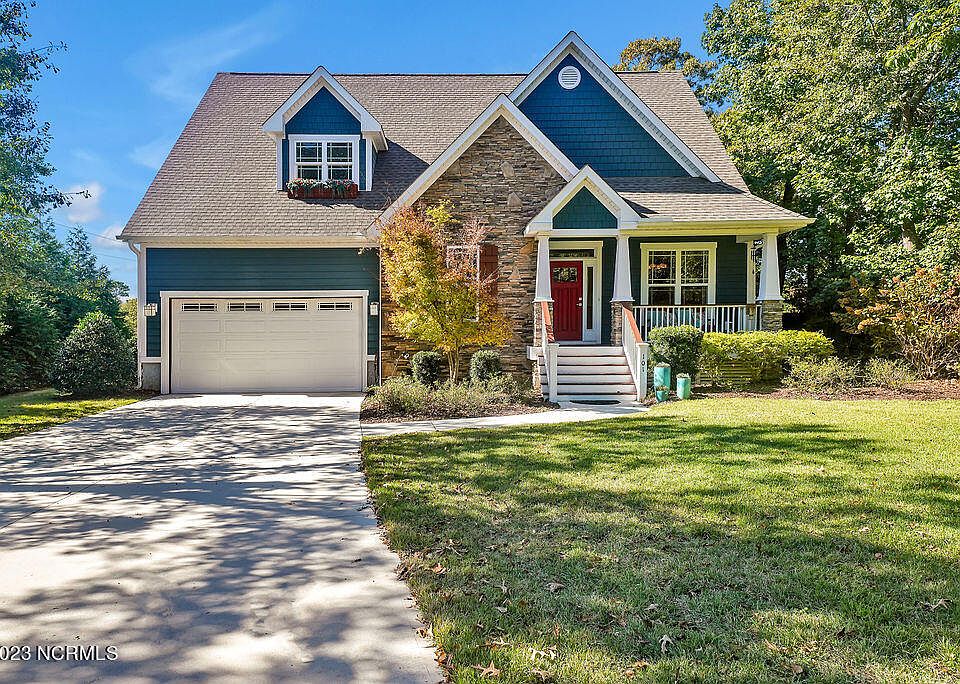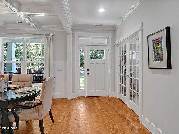 Welcome to 101 Teal Circle, a stunning 3-bedroom, 3-bath waterfront paradise nestled along a tidal creek, where the tranquil beauty of the water meets the comforts of home. This exceptional property boasts the luxury of a deep-water boat ramp easement, ensuring easy access to the intracoastal waterway and no home owners association. Step inside and be captivated by the rich elegance of hardwood floors throughout. The spacious living areas are designed for both relaxation and entertaining, with a seamless flow from the 2-story, open-concept living room to the beautiful kitchen, complete with high-end appliances, custom wood cabinetry, gas cooking, quartz countertops, and a butler's pantry that connects to the dining room that is adorned with a coffered ceiling.