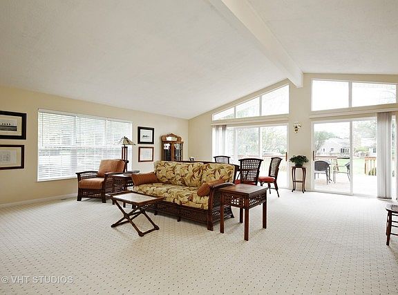Contemporary Ranch with open floor plan completely updated throughout on a mature 1/2 acre setting! Great room features beamed cathedral ceiling with double sliding doors to large deck for entertaining.Fully applianced kitchen with white cabinets adjacent to dining room/family room with gas fireplace (wall unit w/TV included). Roomy Master bath with walk in closet.