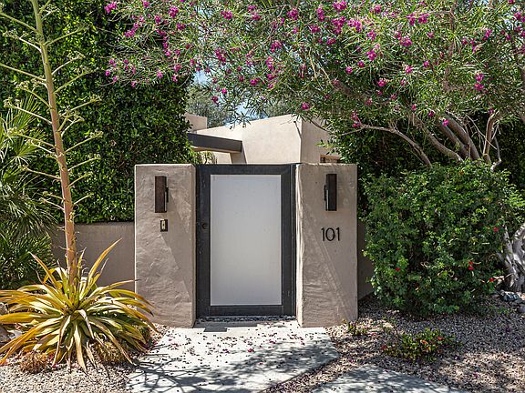 BACK ON THE MARKET! Property was not available for showings, so it was withdrawn. It's now ready for you to feast your eyes on this desert modern beauty. As you arrive at this secluded, small, gated community, you will experience a special feeling of being away from it all in your own private oasis. The original designers created Vail Dunes with the most demanding homeowner in mind. Former model with many upgrades, such as high 14' ceilings, and much more. Entering the front gate to a well-landscaped enclosed front patio, you will know you are entering one of the most exclusive properties in Rancho Mirage. Once inside, you find an open and spacious floorplan truly designed to satisfy all your senses. From the all-glass floor-to-ceiling front entry to the 28-foot wide retracting Fleetwood glass door panels that lead you into the outdoor entertaining area, to the open floorplan designed for entertaining, with built-in iPad-controlled high quality sound system throughout. The kitchen is fully equipped with topline stainless steel appliances and oversized island plus a large walk-in pantry. Enjoy the nicely designed wet bar with built in wine cellars. You will be surprised by the large and well-distributed floor plan consisting of an amazing master suite with nice sitting area, a soaking tub and large glass-enclosed shower. The Master BR boasts a walk-in closet large enough to almost be considered an extra bedroom, with custom-built wall-to-wall shelving. All rooms enjoy remotely operated custom UV protecting window shades throughout. Each of the three additional junior suites boast their own full bathrooms with glass-enclosed showers and sliding glass doors plus remote controlled ceiling fans. From the large family room and through the oversized sliding glass doors you transition to the wonderful outdoor covered lounging area with warming fire pits and refreshing pool & spa. A cooling misting system keeps you refreshed even in the hottest days of summer, and there's even a strategically placed outdoor shower. A large outdoor bar makes sitting outdoors a complete delight. A large 3-car garage is set up with an EV recharging station. Tank less water heater and large laundry room with lots of storage cabinets. There is so much more to this home that words cannot describe. A must see to appreciate. This home has lots of high tech upgrades and is offered including all furniture and electronics for the right offer.
