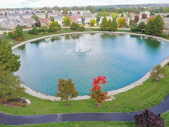 Ranch home on a Premium Lot with Water View & Walking Trail off the culdesac: View, extra Parking, & Walking Trail! Inside, enjoy the spacious entry to Vaulted, Open, Floor Plan. Great rm has gas fireplace, lighted ceiling fan & neutral carpeting. The heart of the kitchen: a Large rectangular, bi-level island with breakfast bar & room for 3 bar stools. Kitchen has white appliances: newer dishwasher, overhead microwave & electric stove. Breakfast area has a Bay Window with sliding glass door leading to LG 20 x 20 Patio. Master Bedrm Suite has lighted ceiling fan, 10 x 4 walk-in closet & Bath with grab bars, vanity & shower. 2nd Bedrm has pocket door to 2nd full Bath. Finished Lower level has 3rd Full bath, Sleeping Area & LG Family rm. Glass block windows in Lower Level. Backyard is level with vinyl fencing & backs to common ground. Right side-yard is adjacent to grassy field. Left side-yard has sidewalk from driveway to backyard. Newer Architectural shingle Roof. Newer AC compressor.