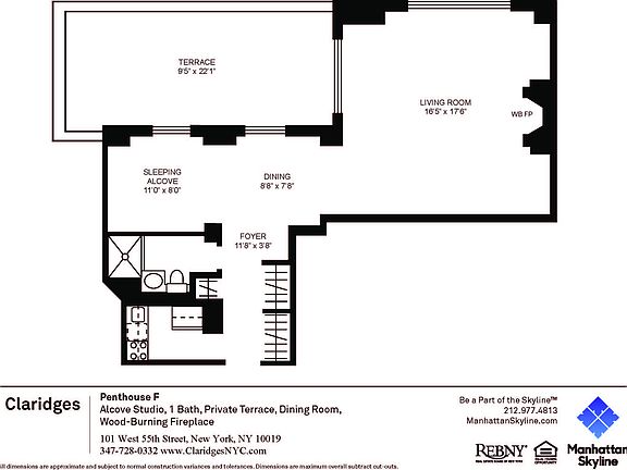 East facing penthouse level alcove studio home with a large living room, wood-burning fireplace, large private terrace, tall beamed ceilings, and crown moldings. Kitchen features custom cabinetry, stainless steel appliances, and granite countertops. Foyer with two large closets. Claridges is a full-service, white-glove doorman building with elevator, laundry, valet, fitness center, and in-house Resident Manager.