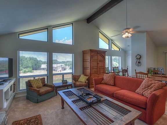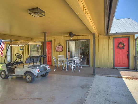 Enjoy the Lake LBJ lifestyle without the waterfront taxes with this exceptional home offering easy access to Lake LBJ from the private neighborhood boat ramp located just down the street. The home features an open floor plan, large living room with vaulted ceilings, masonry fireplace, custom built-ins, cozy breakfast nook, and an abundance of natural light emanating from walls of windows. The chef will be right at home with the kitchen offering tiled floors, walk-in pantry, breakfast bar, plentiful cabinetry, generous countertop space, and a full complement of appliances including wall oven and smooth cook top. The spacious master suite offers carpet, ceiling fan, his/her closets, and an en suite bath. Your family and friends will love the two guest rooms which easily accommodate king sized beds and have access to a hall bath with updated fixtures and a tub/shower. The home is situated on an oversized corner lot, which is conveniently located across the street from the #3 Tee box. The exterior features include standing seam metal roof, great yard, 2-car covered carport with excellent overflow parking, 2 large storage areas, and a comfortable outdoor sitting area. Blue Lake Estates' amenities include a private boat ramp, waterfront park, tennis/sports court, and one of the Top 25 9-hole golf courses in Texas. This is a great opportunity to affordably own a weekend retreat or full time residence in the coveted resort community of Blue Lake Estates.