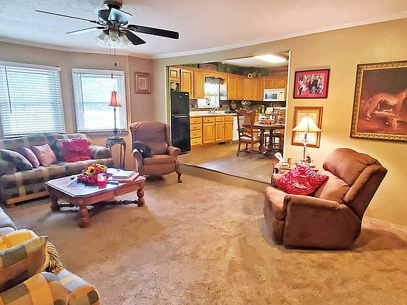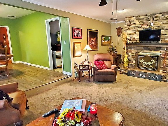 Corner lot with a country feel just outside of town. Large Screened in porch and privacy fenced in yard featuring a storm shelter and shed. Open Kitchen to the Living Room featuring a nice Fireplace. Three Bedrooms with Large Bathroom and a Bonus Bathroom. Landscaped yard with shade trees and asphalted driveway. Also features an attached one car garage with opener. Updated Vinyl Windows too!
