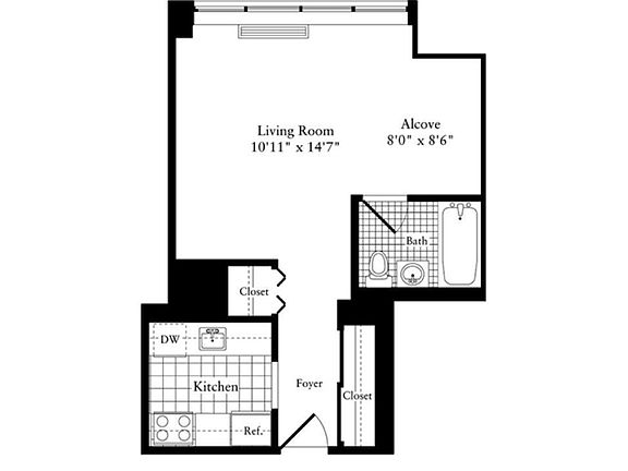 This studio has a wonderful layout. The kitchen contains granite countertops, a dishwasher, a microwave, and ample storage space in this newly renovated luxury building.