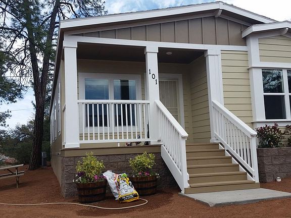 Beautiful, brand new 2017 top of the line manufactured home. Never lived in. Many upgrades including R-50 insulation in ceiling, new slate GE appliances with upscale cabinets, 9 ft. ceilings throughout with coffered (recessed) in both living and MBR. Tile shower in MBA with double lavy. Fireproof/bugproof exterior concrete siding. Trex decking on front porch. All on beautiful lot with huge pine trees and only 1 block from Walmart and Bashas. Even has drive thru with additional access from back alley and room for RV parking. Prepare to be amazed, especially for such a great price!!!