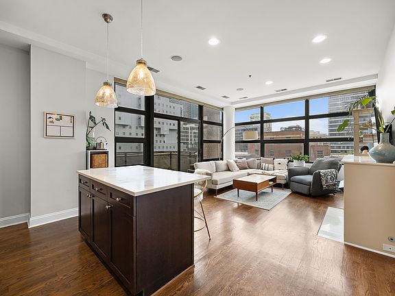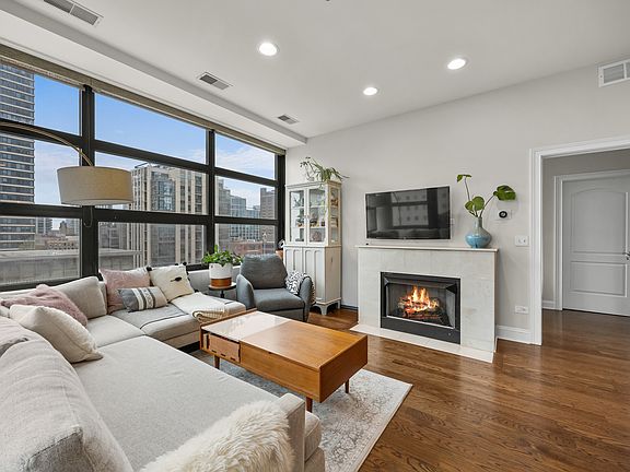 Welcome to this bright, southwest corner unit 2-bedroom, 2-bathroom condo situated in a boutique building in River North! Floor to ceiling windows invite you into this warm, move-in ready space featuring a spacious living room offering gleaming hardwood floors, gas fireplace, custom window treatments and surround sound speakers. Stunning updated kitchen with a large island, quartz countertops, custom espresso shaker cabinets, tile backsplash, stainless steel appliances, an under-mount sink and adjacent pantry closet! Gracious primary bedroom offers a walk-in closet and an en-suite bathroom with updated quartz vanity, gold accent light fixture and mirror along with a large walk-in tile shower. Second bedroom makes for a perfect guest bedroom or home office space accompanied by a full hallway bathroom with jetted tub and tile shower. Two large outdoor living spaces with city views, in-unit laundry, and an abundance of closet space complete this home. Excellent location near world-class dining and shopping along with easy access to Brown and Red Line CTA stops.
