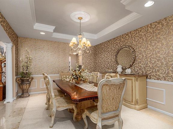 - Separate Dining, Bookcases, Coffered Ceiling(s), Special Millwork, High Ceilings, Walk-In Closet(s), Bar, Breakfast Bar, Breakfast Room, Butler Pantry, Kitchen Island, Custom Cabinetry, Eat-in Kitchen, Solid Surface Countertop(s), Double Vanity, Lever Faucets, Tub, Entrance Foyer