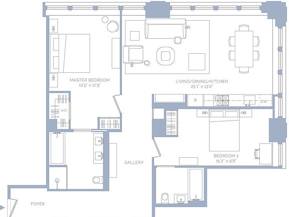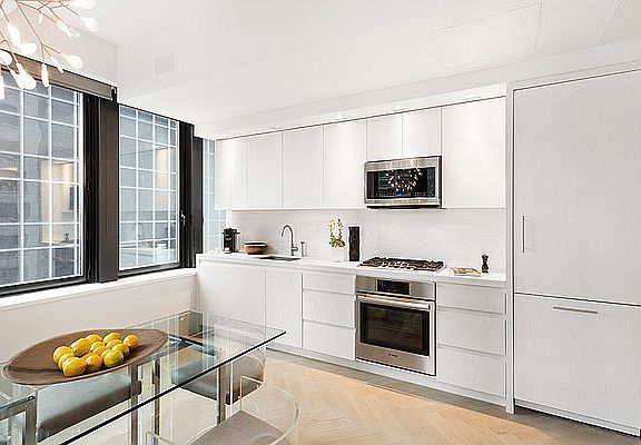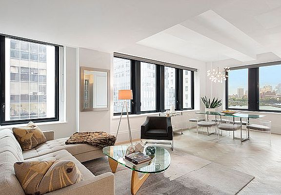 NO BOARD APPROVAL - SPONSORED UNIT Welcome to 101 Wall By the Water, the newest luxury condominium development where the Seaport meets Wall Street. A flawless corner condominium graced with a collection of stunning fixtures and finishes, this 2-bedroom, 2.5-bathroom home strikes the perfect balance between aesthetics and functionality. Features of this 1,417 sq. ft. apartment include large casement windows, Northern and Eastern exposure, gray herringbone hardwood floors, recessed lighting, beamed 9-ft ceilings, 11-inch baseboards, and a convenient in-unit Bosch washer and dryer. Beyond a practical entryway space adorned with a coat closet and powder room, the home flows into an open-concept living room, dining room, and kitchen. The living and dining rooms are flanked by wall-to-wall windows with views of the East River, while the elegant all-white kitchen is equipped with custom oak cabinetry, honed marble countertops and backsplashes, and a suite of fully- integrated appliances by Bosch. Both bedrooms enjoy a comfortable level of privacy thanks to a thoughtful split-wing layout. The spacious master bedroom possesses ample closet space as well as a pristine en-suite bathroom with dual sinks, marble walls and floors, chic fixtures, a walk-in rain shower, and a separate soaking tub. The second bedroom boasts a large reach-in closet and an immaculate en-suite bathroom. 101 Wall By the Water is a luxury condominium situated in the Financial District. The building lies just one block from the East River and provides residents with a host of thoughtful amenities that include private storage, a lounge, a quiet library, a childrens playroom, game room, fitness studio with state-of-the-art cardio and strength-training equipment, sauna, a golf simulator, and a landscaped rooftop terrace complete with a gas grill and comfortable outdoor seating. The building is surrounded by a number of high- end restaurants, cafes, bars, and shops. Nearby subway lines include the 1/2/3/4/5/N/R/W/J/Z.