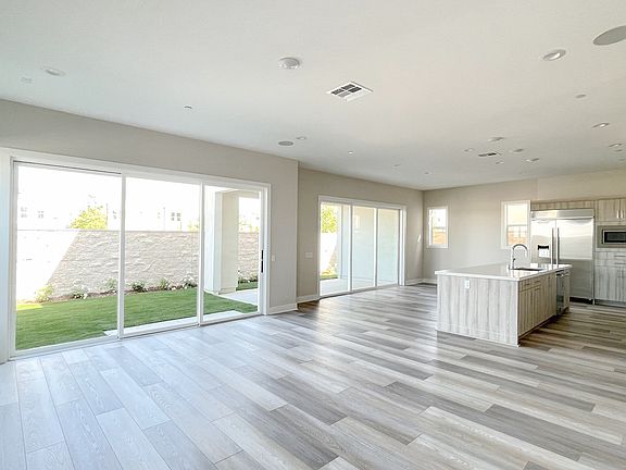 As you step inside, you'll immediately notice the high-end waterproof flooring that graces the great room and kitchen, adding a touch of elegance to the living space. The well-appointed kitchen offers a picturesque view of the bright casual dining area and comes complete with a large center island featuring a breakfast bar, a built-in refrigerator, ample counter and cabinet space, and a generous pantry for all your storage needs.