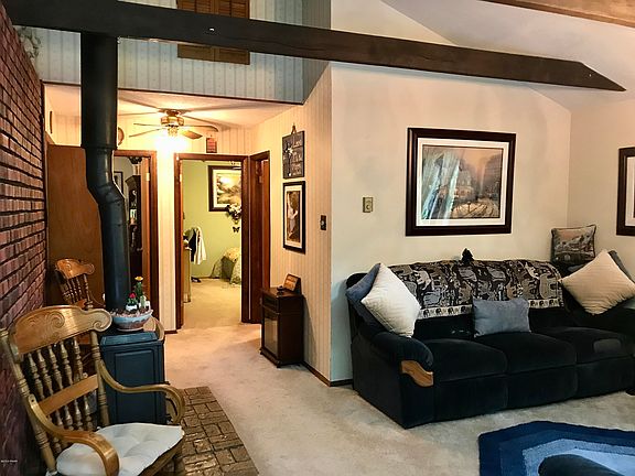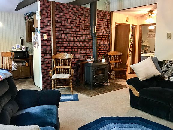 Comfy Cozy Ranch home with privacy. Open and airy Living room with Cathedral ceilings Glass sliding door to outside and a Wood burning stove . Two large bedrooms 1 with a walk in closet . Dining off the kitchen. Washer and dryer area. Great deck to unwind. flat level yard with Shed for added storage. Tranquil setting.