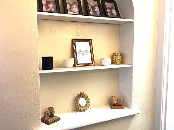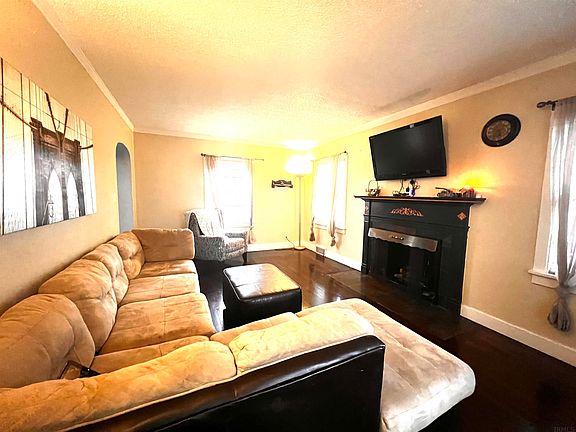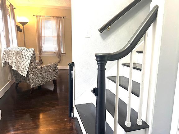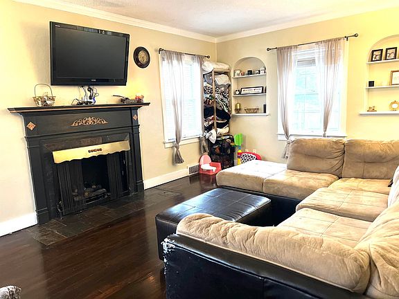 History, Charm, HOME! This two story 3 bedroom 1 1/2 bath home with full basement features large living room with gas log fireplace, built in shelving, original hardwood flooring and awesome natural light. Fully applianced kitchen with updated cabinetry and large dining room allow for space to gather and enjoy sharing a meal. The main level also is home to a laundry room and half bath with the upper level featuring bedrooms and a full bath. The unfinished basement has many possibilities as there is perimeter drainage already in place. Home is situated on a corner lot and is complete with a two car attached garage, a fabulous back porch, and a shed for storage. Fence in a side yard if desired for secured grassy outdoor space.