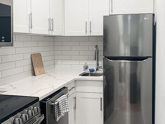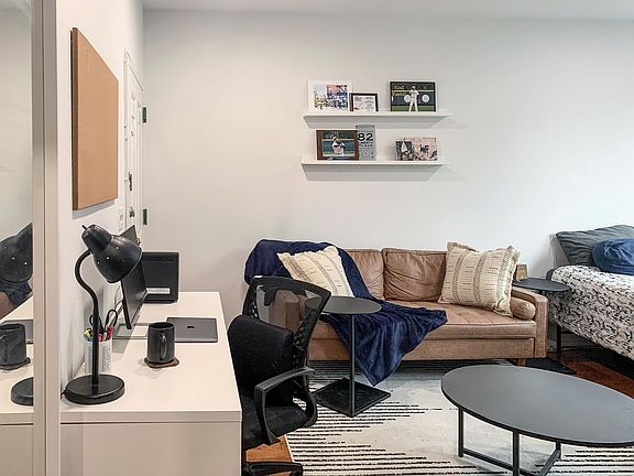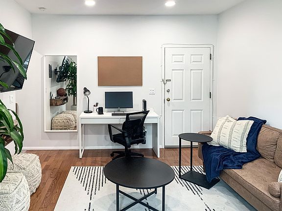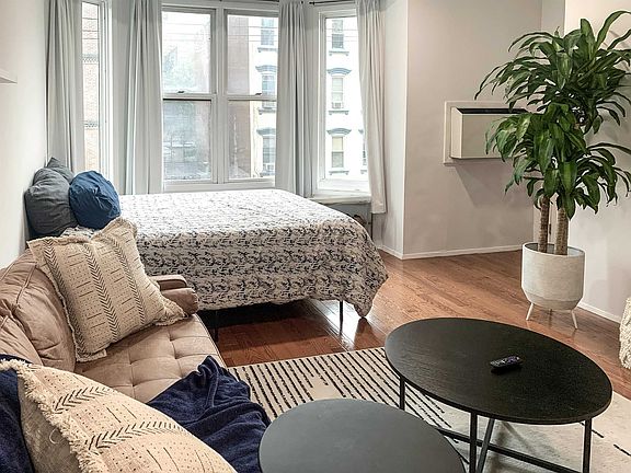 Fully furnished studio, perfectly situated in the prime downtown Hoboken location! The apartment has been recently renovated space, complete with a renovated kitchen that features subway tiles, quartz counters, ceramic flooring, and extra-tall cabinetry. The kitchen is also fully stocked with all the essentials, including pots, pans, a coffee maker, and a blender. The full-size bathroom. Natural light and a spacious walk-in closet that provides ample storage. The apartment is also fully furnished with a wall-mounted 60" smart TV, a queen bed frame (mattress not included), a leather loveseat, and a desk, making it easy to move right in and make yourself at home. On-site washer/dryer. This furnished studio is the perfect choice.