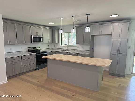 The heart of the home is the fully renovated kitchen, boasting all-new appliances and finishes to include upgraded cabinetry and a large island with a butcher block counter top, perfect for gatherings or casual meals.