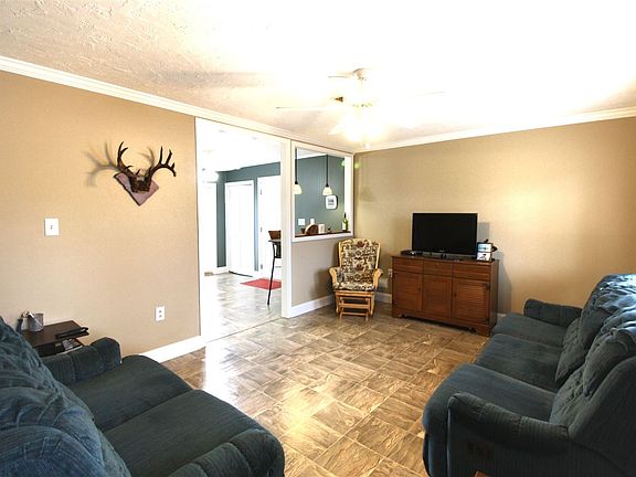 This spacious ranch style home is conveniently located close to town and schools with a peaceful neighborhood setting. The open floorplan features a welcoming living area with lots of natural light and opens into the updated kitchen and dining area; complete with island, Corian countertops, integrated sink, bar seating opening to the living room, and abundant counter and cabinet space. A hallway leads to three bedrooms and a full bathroom. Relax on your back deck overlooking a large yard perfect for outdoor activities and play, as well as an outbuilding for additional storage. An attached carport with laundry area and storage is also located off the kitchen. This homes has many updates including flooring, paint, fixtures, appliances, countertops, insulated windows and HVAC system (4 years old) adding to the home's thermal efficiency. Great starter home or rental investment property.