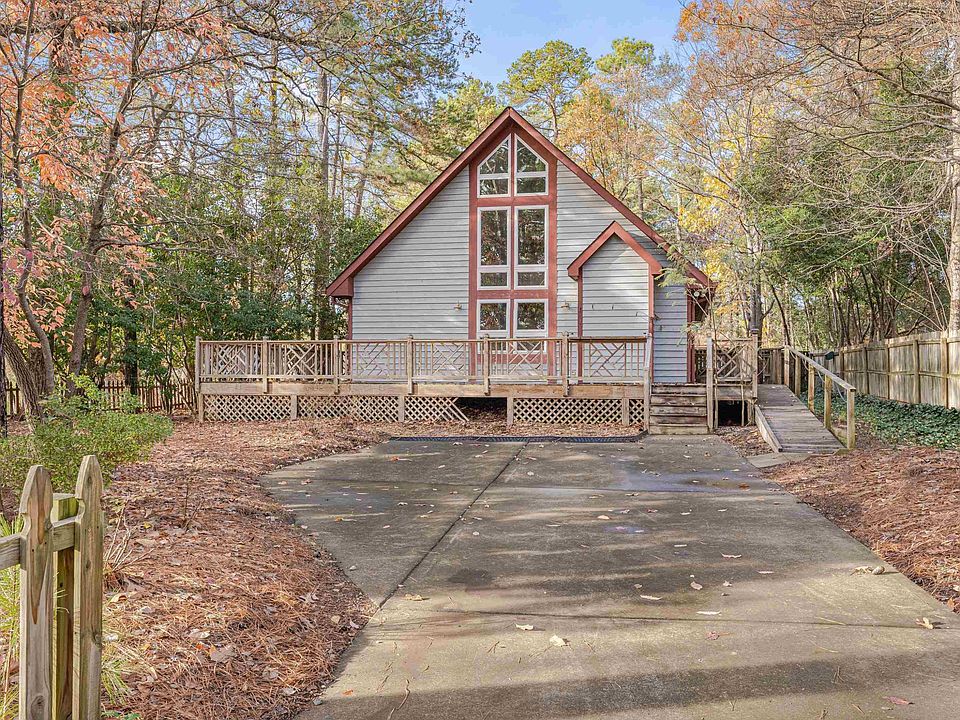 Welcome home to your own N. Raleigh retreat where it feels like vacation year round! This light filled A-Frame has all the character you would expect and MORE. Bright open living space w/ dramatic floor to ceiling windows, stonework, and open floor plan! Indoor/outdoor living dream w/ huge wrap around porch, fenced in backyard, mature trees on almost a ½ acre. Private owner’s suite on 2nd floor, with WIC and cute loft! Large bedrooms! Storage galore w/ 2 utility sheds AND 12x32 workshop that could be converted to a home office, hobby room, flex space - prewired and ready for YOU! NO HOA!!! (Short term rental anyone?) Less than 10 min to 440, 540, Shelly Lake, greenway trails & North Hills/Midtown, for dining/shopping and FUN!! This home puts the “OH!” in Potential!
