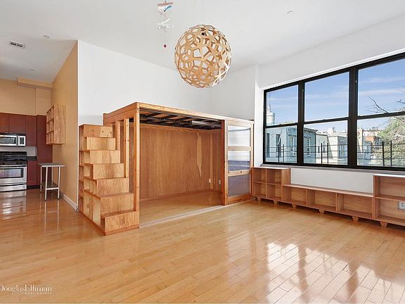 ONE OF A KIND converted Industrial loft 1 Br w/sleep loft/home office! Corner unit with excellent light, 12' ceilings, oversized windows, beautiful handcrafted built-ins accentuate this artist space- Bookcase/staircase to the sleep loft which easily accommodates a queen sized bed, plus custom storage in every room, Enjoy all the modern conveniences one might expect in contemporary condo living, washer/dryer within the unit, video intercom, central ac and a common roof deck with incredible skyline views. Granite and marble finishes, conveniently located around the corner from DeKalb, 3 minutes to Jefferson stop. 101 Wyckoff is near Bushwick parks and Bushwick vibrant cultural experience of arts, cafes, shops, nightlife & restaurants. East exposure, North exposure, Hardwood fls, Modern kitchen w/dw. Great closet space, Security system.