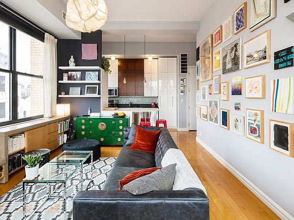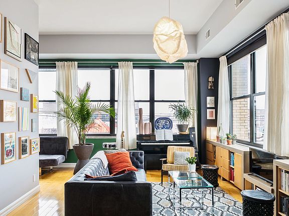 Welcome to Loft 3B at Wy 101, perfectly situated in the heart of Bushwick amongst its plentiful art galleries and dining destinations. Originally built in 1925, this 4-story warehouse was converted into 29 remarkable true lofts when it was reimagined in 2006. Offering a perfect blend of expansive, voluminous spaces with modern convenience, residents are treated to unparalleled floorplans, beautiful finishes and utmost privacy in a consummately chic location. This perfectly positioned, 1,152 square foot, corner loft is currently configured as a two-bedroom with separate office alcove and benefits from two full bathrooms. The expansive great room, with its dramatic 12 ft. ceiling heights, floods with natural light emanating from a bank of oversized, 6 ft. tall, windows that run 18 ft. along its southern side and an additional 15 ft. along its west. A set back kitchen brings together chef caliber features and an open design ideal for gatherings and entertainment. Cast around an anchored island, it is outfitted with a five-burner gas range, stainless steel appliances (incl. dishwasher & microwave), 30 bottle wine fridge, and generously proportioned white lacquer, wood and stainless steel cabinetry. Highlights: Loft * 12 ft. ceiling heights * Significant window lines * Hardwood floors * Central HVAC * Vented in unit washer & dryer * Ample storage * Videocom * Low common charges of $474/mo. * Taxes: $40/mo. (J51 abatement in place through 2022) Kitchen * 5 burner gas range * Stainless steel appliances incl. dishwasher & microwave * 30-bottle built in wine fridge * European white lacquer, wood and stainless steel cabinetry * Premium countertops Building * Elevator * Common roof deck