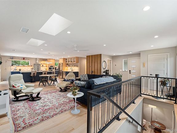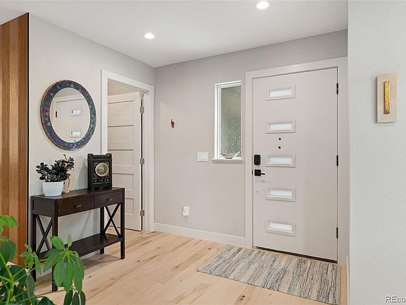 Experience stunning mountain views from this beautifully updated ranch home in the heart of Golden. The main level offers open-concept living with high-end features, smart home technology, and quality craftsmanship throughout. Maple hardwood floors unite the spacious living room, dining area, and gourmet kitchen, which boasts top-of-the-line Bosch appliances, high-end cabinets, large pantry, and an expansive center eat-in island. The luxurious primary suite features a private door to the backyard, and a spa-like en-suite bathroom, complete with radiant heated marble floors and walk-in closet with custom shelving. Two additional bedrooms on the main level are thoughtfully located opposite the primary suite for added privacy, along with a home office filled with great natural sunlight. A custom stair rail leads to the fully finished basement, perfect for multi-generational living or a great rental opportunity. The basement includes two bedrooms, full bath with radiant heated tile floors, a bonus nook space, a gym or home office, and a stylish open living room with a full kitchen. The private entrance enhances its functionality for extended family or tenants. The backyard oasis is ideal for entertaining, with plenty of space to relax and soak up the Colorado sunshine. The property includes interior parking for four vehicles, with extra room for a workspace or storage. Energy-efficient solar panels add to the home’s appeal, keeping energy bills low. Outdoor enthusiasts will appreciate the abundant nearby trails for hiking, mountain biking, and trail running. Water adventurers will love Clear Creek, just blocks away, offering fishing, kayaking, and rafting opportunities. Golden itself is rich in history and features a thriving art scene along with diverse dining and shopping options. This move-in-ready gem is a must-see!