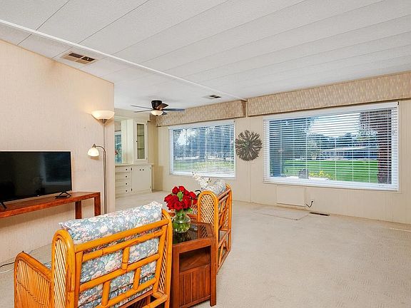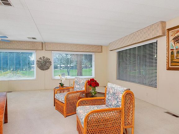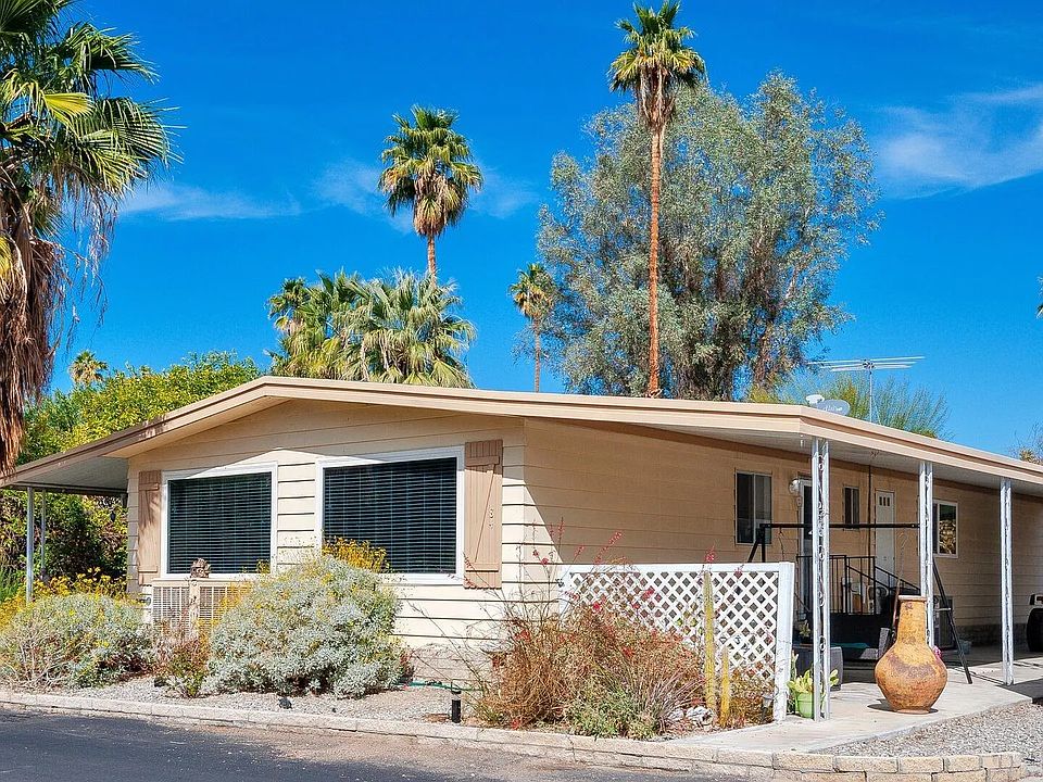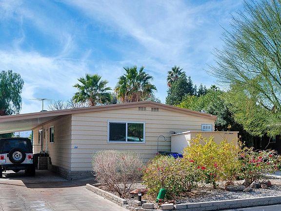 This is a well cared for 2 bd 2ba home that has been partially remodeled with new paint, new sinks, faucets, countertops, stove, swamp cooler pump, ceiling fans, water filtration system. Excellent location near the club house with large viewing windows, and comfortable floor plan. Covered patio area with screened in porch, fruit trees, shed and many extras. The RoadRunner Club is an active 55+ community with 2 golf courses (reasonable rates), Pool (open 24 hours), jacuzzi, exercise room and more. Too many activities to name.... you will love the community atmosphere. Monthly land lease $920.