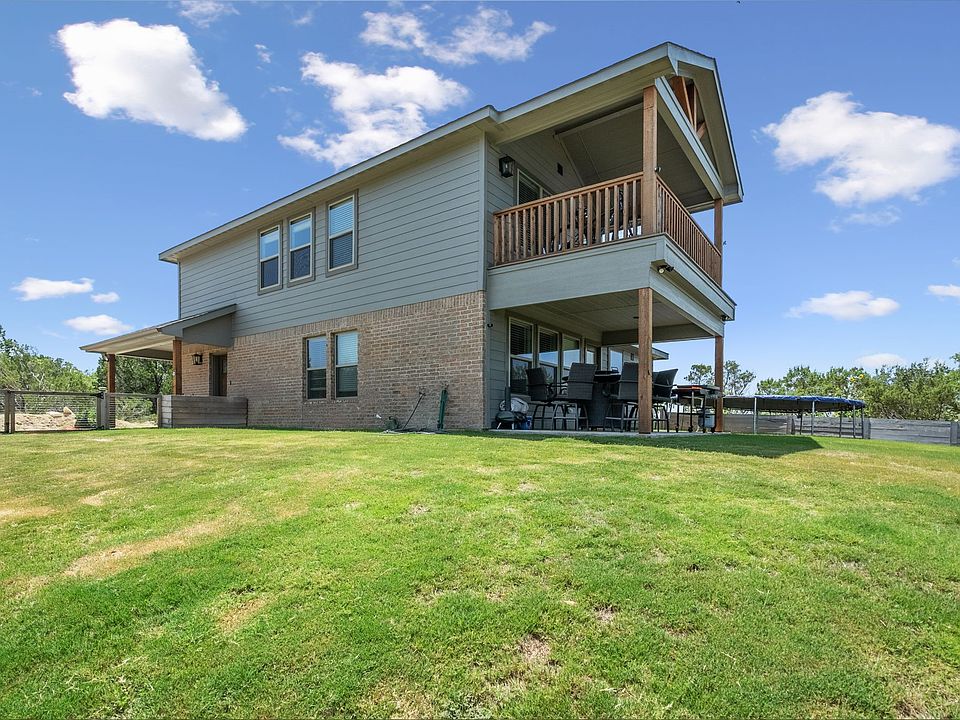 Beautiful home stunning views from this almost new constructed home offers a unique blend of luxury and affordability. Boasting 3 bedrooms, 2 and a half baths and loft, this home provides ample space for comfortable living. Long-distance views can be enjoyed from the private master bedroom balcony, where you will find yourself overlooking the beautiful hill country and the vast ranch behind you. You will love the covered back patio that invites you to relax and take in the serene surroundings of the spacious 1-acre plus lot. The interior is beautifully finished with Quartz counters, custom cabinets, built-ins in loft area and luxury vinyl plank flooring, adding a touch of elegance to every corner. Large backyard with planter fencing and walkway to outdoor area with fire pit. Enjoy what this development offers, two private lakes, community pool, clubhouse, play and exercise park, community garden & more.