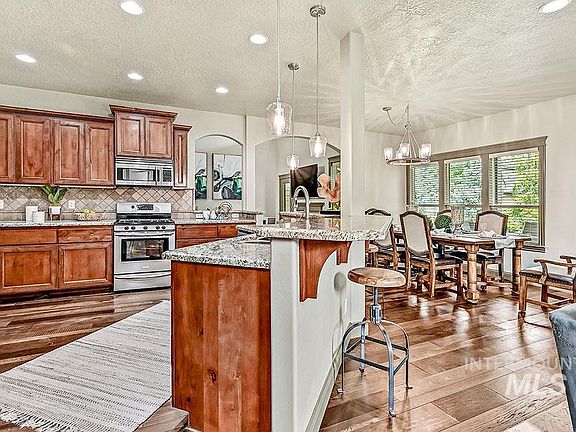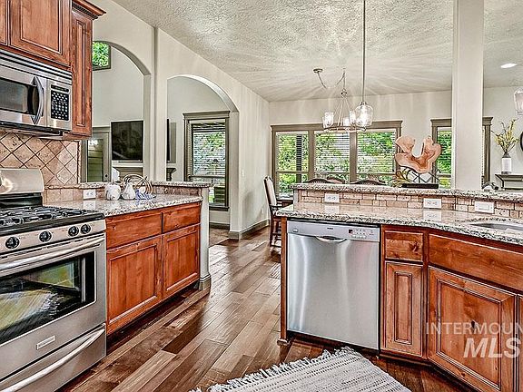 A beautiful and spacious home set in a SE Boise hidden gem community, Promontory Ridge. This insulated neighborhood has great proximity to attractions, and has a small community feel with wonderful amenities. Pristine landscape and gorgeous architectural details radiate exquisite curb appeal. Inside, the fabulous floor plan is perfect for today's remote-work lifestyle with a main level office and primary suite, and additional bedrooms and bonus room situated upstairs. Two-story ceilings amplify the space in the living room, where a patio door leads to the backyard for quick access to the outdoor spaces. Elegant archways and quality details enrich the home with character and a luxurious feel. The spacious kitchen features ornate-detail cabinetry, professional series stainless steel appliances, granite countertops, and an open flow to the dining space and great room. Tucked away on the main level, the primary suite includes a spa-like bathroom and generously-sized walk-in closet.
