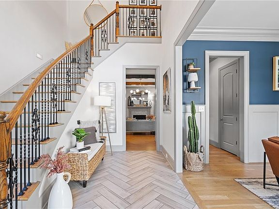 Welcome to Brookberry Farm, a picturesque neighborhood known for its charm. This Pottery Barn-inspired home offers classic elegance and modern comfort. Inside, soaring ceilings and striking beams in the living room and master bedroom create an inviting atmosphere. The spacious kitchen, featuring a 10-foot island, is perfect for cooking and casual dining. The open floor plan enhances flow for entertaining and daily living. The property includes a three-car garage and an unfinished basement with potential for an additional 2,000 square feet, thanks to its high ceilings. Enjoy a screened-in deck and open patio in the private backyard, buffered by trees for a serene retreat. This home beautifully combines style, comfort, and functionality in a delightful setting.