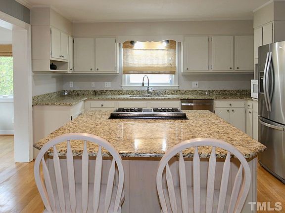 For sale is a one-level 3-bedroom house on a 1/3 acre lot, just a short distance from Bond Park * Site-finished hardwood floors (no carpet anywhere) * Large kitchen (with island, granite counters and stainless steel appliances) * Stone fireplace * Beautiful master bathroom with a soaking tub and tile shower * Fenced yard * Detached garage/workshop. Regarding the size of the house, the 400 SF addition may not have been permitted (Cary records only go back to 1990). We have included its area in the 2200 SF.