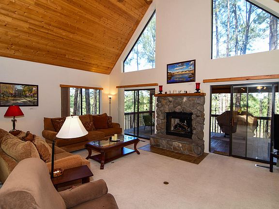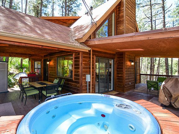 Beautiful mountain cabin tucked away in the pines of the Hassayampa Mountain Club just minutes from downtown Prescott. This three bedroom home boasts open concept living with soaring knotty pine planked ceilings, expansive picturesque windows, stone gas fireplace and 3 levels. From the large covered deck you can enjoy the views of Thumb Butte while relaxing in the spa.
