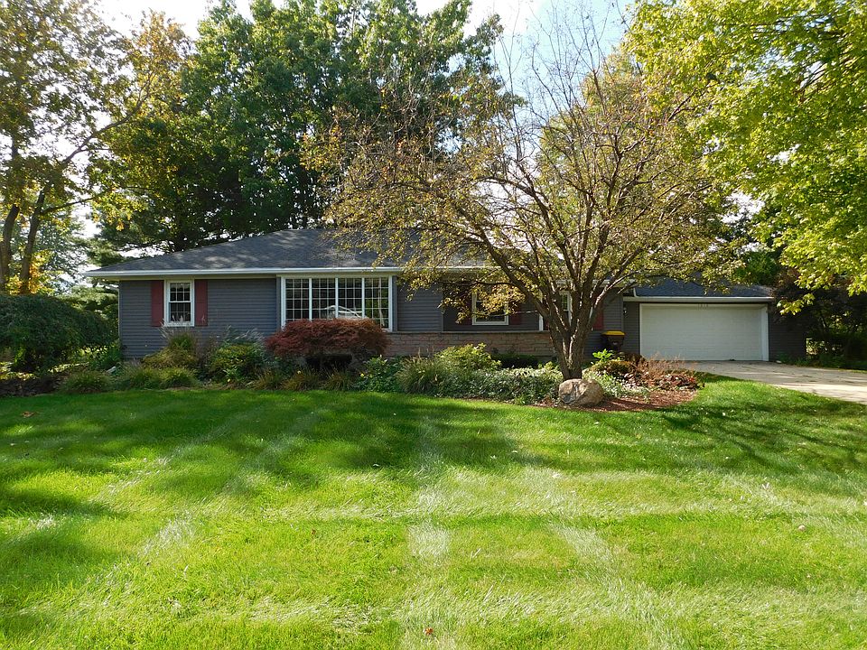 Sharp landscaping, paver stone patio, 2.5 car garage, 3 bdrms, 2 full baths, 1st floor laundry, family room, many updates! Large side entry has tile floor, double wide closet, leads to garage, kitchen & large full bath laundry area thata(tm)s all new: large shower unit, stool, vanity & cultured marble top, heat lamp, updated plumbing & paint.Cozy Family Room & quadruple window wall & sliders to patio, large bay window & window seat, free standing gas fireplace & view of large back yard! Oak kitchen: tile floor, appliances & mini desk or mini side bar. Dining area has hardwood floor & extends into living room that has front entry & large window wall view of colorful landscape! Bedroom wing is 3 bdrms. all freshly redone: new paint, carpet & lighting! Hallway has built in storage areas. 2nd full bath redone:new flooring, vanity, lighting, vent fan, paint & frosted window Lower level:new furnace & water heater in 2016, 150 amp service, big Rec Room with electric wall fireplace.Vinyl window