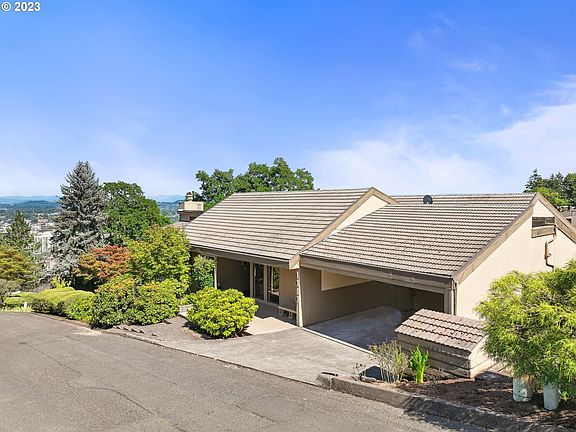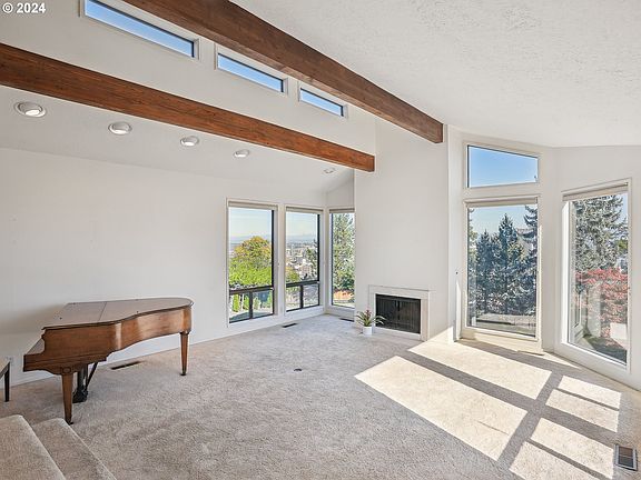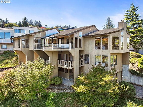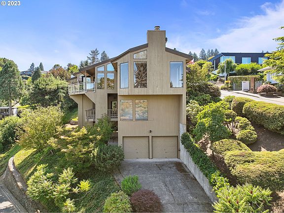 First time on the market in 35 yrs. Impressive corner lot with panoramic views of Downtown, Mt Hood, and St Helens. Formal living room with fireplace, dining room, vaulted ceilings, open layout and expansive wall space for art. Main floor primary suite with office, large kitchen with island and garden room eating area opens to deck. Double car carport opens to first floor. Lower level includes two bedrooms with view windows, 1 bath, family room with built-in bookshelves and deck. Large workshop or artist's studio with built-ins, upgraded electricity, extra storage and attached double car garage on third level. Possibilities for multigenerational living, nanny apartment or ADU. Fantastic opportunity on one of Portland Heights most sought-after streets.