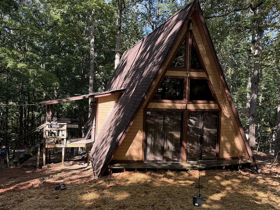Here is a A Frame cabin setting on 7+ acres with a creek setting at the end of a cul-de-sac. This home has a lot of potential, and opportunities for you to put your personal touches on some projects on the property, seller has updated the plumbing to pex, as well as flooring, bathroom, light fixtures, etc Has a walk out basement, and fenced for horses on the property. There is even an old smokehouse on the property. Great for hunting, or making your very own retreat. This property is close Fort Campbell Army Base, Clarksville, TN, Dickson, TN, Cumberland River, boating and fun. Seller will need 7 days after closing for possession because of livestock. Seller is in process of replacing the back deck off the house.