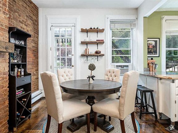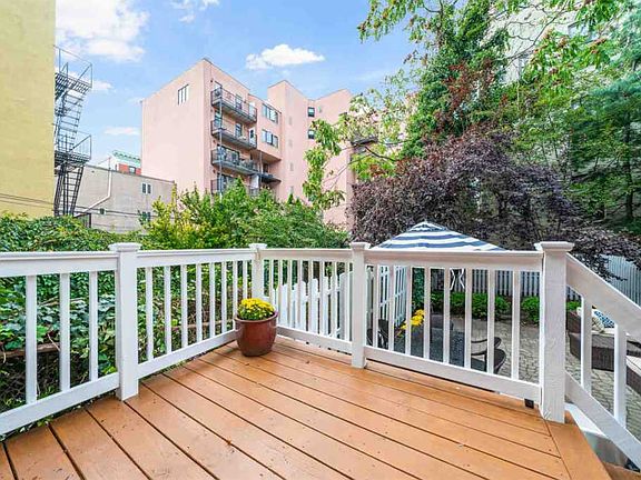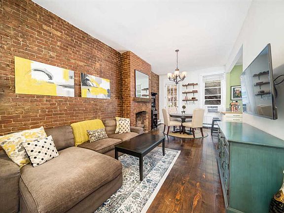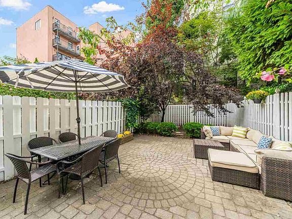 Spectacular brownstone-style 934 square foot 1 bedroom + den parlor level condo with an expansive, private and well-landscaped yard. As you enter this property you are greeted by a large living/dining room with an entire wall of exposed brick, tall ceilings and a gas fireplace. The renovated kitchen open to the living room features tall white Shaker-style cabinets, stainless steel appliances and a breakfast bar. The extra-large bedroom easily accommodates a king-sized bed and a sitting area with TV over a lovely decorative fireplace mantle. The den is perfect for a home office or nursery and includes an entire wall of custom closets. Modern updated bathroom with white subway tiling a frameless glass shower door, modern fixtures and custom wainscoting. Wide-plank hardwood floors throughout. A new deck accessible from the living /dining room leads down to the private and tranquil backyard oasis with custom paver patio, mature trees and plenty of room to enjoy the outdoors. There is also a personal locked storage room plus additional shelf storage in the basement. This truly is an amazing home one of the most fun and vibrant blocks of uptown Hoboken.
