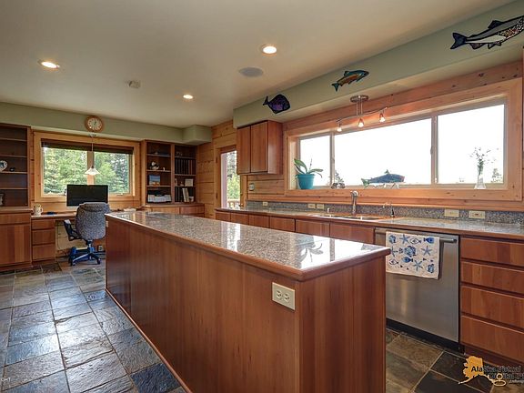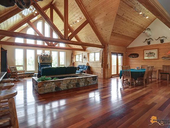 Live the Alaskan Dream in this beautiful Log Chalet with a very private setting on 1.5 acres. You enter the Expansive Great room w/soaring ceilings, exposed log beams, hardwood floors, wall of West facing windows for lots of natural light, gas fireplace and open to dining area, you'll never want to leave. An island kitchen w/Cherry cabs, SS appls, granite tile c/tops, dumb waiter, door to deck.