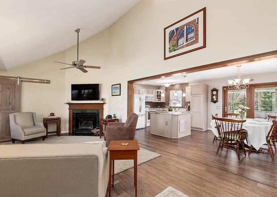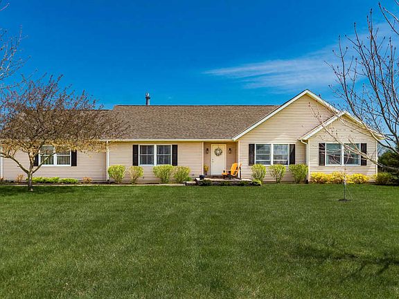 Live large in this updated ranch home with open floor plan which offers 3-beds, 2-full baths, gas log fireplace, first-floor laundry and attached 2-car garage. Updates abound with newer: granite countertops, appliances, and laminate flooring. Kitchen opens to living room and offers island w/storage and an eat-in kitchen space which easily accommodates a table for 8. Enjoy the private 3-season room w/ceramic flooring and access to large poured patio. Three generous bedrooms and owner's own luxurious bath round out first floor. The FULL poured basement has downtown loft-style and is a must see. This 2.75 acre property also offers a detached garage and storage shed. Country living, yet close to Dublin or Plain City. Loads of space for kiddos, pets, hobbies and gardening.