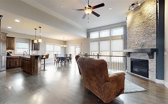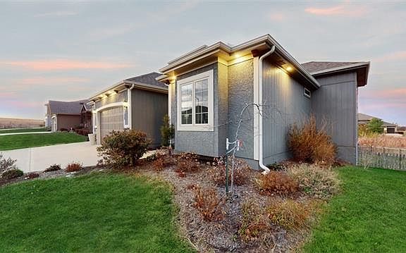 Beautiful home with great floor plan, high-quality interior finishes, motorized window treatments, Advantium microwave/grill cook unit above a gas stove. Covered deck provides additional living space. Huge master bedroom and bath with beautifully tiled walk-in shower with rain-shower head. Granite counter tops in Master Bath, Kitchen and Dry Bar. Tiled guest bath tub/shower. Downstairs features a large entertainment area with dry bar, large bathroom with tiled shower and two large bedrooms with walk-in closets. Lots of storage area as well. A whole house water filter, water softener, surge protection system and Ring door bell have been added and are staying with the home. Walk-out goes onto large custom stone stamped patio with built-in fire pit. Home backs up to treed green space and large 1/3+ acre yard provides privacy. Come check it out, you won't be disappointed.