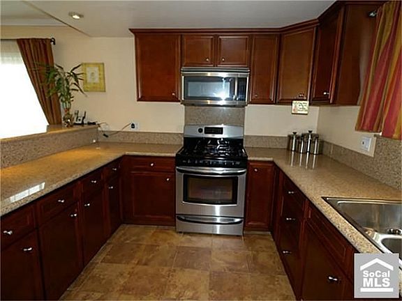 Outstanding interior lot location on this highly upgraded home. Spacious living room with fireplace and glass sliding door opening to patio and large sunny south-facing rear yard. Gorgeous remodeled kitchen with recessed lighting, beautiful cherry wood facia cabinetry, granite counter tops, stainless steel appliances, sink and porcelain tile flooring. Large sunny dining area with custom overhead light fixture. Upgraded dual-paned windows and raised panel doors. Downstairs guest bath highly upgraded as well with tile flooring and upgraded vanity and mirror. Recessed lighting in living room as well. Spacious master suite with big walk-in closet. Lots of custom crown molding and baseboards too. Smooth refinished ceilings thoughout most of home. Manicurred landscaping with beautiful brick front walkway and brick-laced concrete driveway. Near bike trail to beach, shopping and fine dining. Outstanding opportunity in great neighborhood.