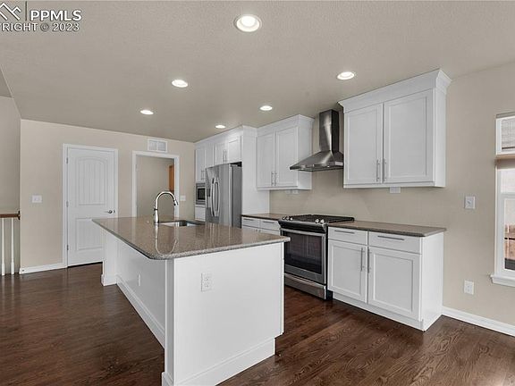 Elegant, like-new Cordera ranch-style home with beautiful updates and all the fabulous Cordera amenities! New, professional front yard landscaping complete new sod & a new sprinkler system, provides beautiful curb appeal and an inviting welcome. Step inside to a grand open floorplan enhanced with striking hardwood floors, abundance of natural sunlight from many oversized windows, a perfect neutral color palette, and a cozy fireplace with natural stacked stone surround. Chef-worthy kitchen boasts ample white cabinetry with elegant crown molding, a desirable 5-burner gas cooktop with chic overhead hood, pantry, and expansive center eat-in island. The open dining room flows directly off the kitchen and has 2 walls of side-to-side windows giving the space an extra dose of cheerful sunlight. Two main-level bedrooms are located opposite one another for extra privacy. This spacious retreat features vaulted ceilings, a large walk-in closet, and convenient en-suite bath. Bonus flex room on the main level would make a great home office, formal living room, or play room. More living space found in the fully finished basement complete with two more generous-sized bedrooms, full bath, and extensive family room with 3 egress windows and recessed lighting making the room plenty bright! Oversized living room sliding door leads to the large private backyard with a spacious concrete patio and new concrete pathways leading to sitting area with lighting so you can relax and take in the majestic Pikes Peak views. Backyard also has new sprinkler system and drip lines. New AC in 2019! Peaceful community with easy access to plenty of walking and biking trails and community parks. Also walk to several restaurants and shops, schools, and close proximity to Union/Powers/Grand Cordera Parkway to get you anywhere you need in minutes. This move-in-ready charmer simply needs you to call it home! Virtually staged photos used in this listing.