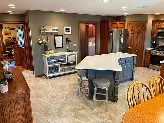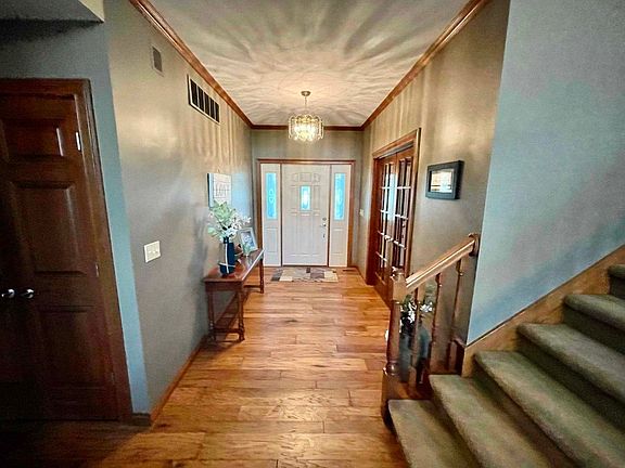 OPEN HOUSE, SUNDAY OCT24th from 12 to 2pm. Welcome Home! This beautiful 6 bedroom, 3 1/2 bath home includes a finished, walk-out basement and sits on 5.2 acres. As you walk in, the grand room includes a vaulted wall of windows that overlook a half acre pond that is cleaned and stocked. New wood flooring in the great room and front room. The spacious kitchen is updated with new cabinets, refrigerator, range, flooring, Spanish lace ceiling, and large island. The main-level, master suite is has a trey ceiling, jetted garden tub, walk-in closet, and a private deck to enjoy a relaxing view of the pond. The finished, walk out basement contains two bedrooms, one full bath and over 300 sq ft of storage space. The 40 x 60 outbuilding can hold up to 6 cars, lots of equipment, or would be great for hosting large family get togethers. The attached, 3 car garage contains a pull down attic and water softener. Furnace and AC unit are one year old. Roof is 5 years old. Water heater is two years old. Welcome to your dream home!