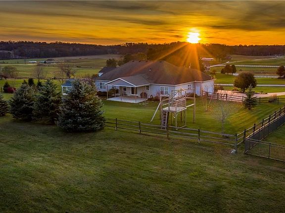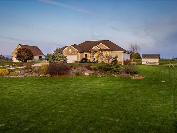 Spectacular views! Immaculate home! Fantastic location! This home sits atop a hill with a circular drive and a 3-car garage. This ranch offers the highly sought after open floor plan with the split design meaning Master Suite on one side of the home and the remaining bedrooms on the other. First floor living at its finest. This home sits on just over 2 acres with split-rail fencing in the back to keep the little ones safe, the dog from taking off and it is just an all around great area for entertaining on the new patio with covered roof (2018). There is new laminate wood flooring (2017) throughout the great room and eat-in kitchen. The kitchen has a ton of cabinets, new faucet and an Amish made maple butcher block. The foyer area has awesome shelving units that just add character. The office has french doors and it is located far enough from the main living area to allow for privacy if you work from home. The formal dining area sits directly across from the office. The eat-in kitchen area allows for views through the new sliding glass door (2018) into the back yard. There is a gas fireplace with a blower in the great room for those cold Winter nights. First floor laundry with plenty of storage. New 16' X 12' barn in 2015. There is a water plant in the basement (2017). The full basement could easily be finished. There is a field behind the home that just adds extra privacy. There are newer light fixtures, new garage door openers, and much more!
