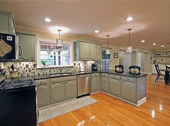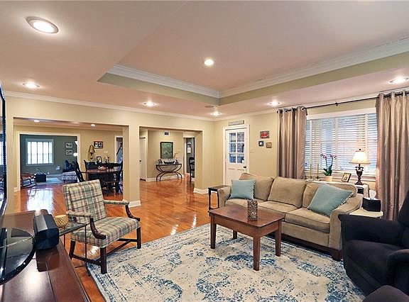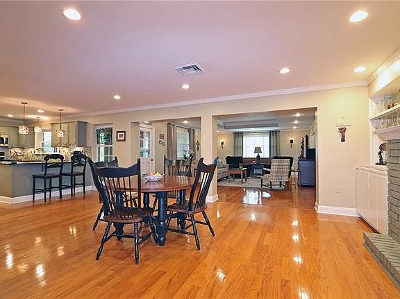 Perfect for entertaining! This 4 bedroom home is located on a beautiful lot with a large back yard, built in fire pit & pergola! Flowing Open floor plan with Wood Floors in the living room, dining room, breakfast room & den. 9' tray ceiling in den! Kitchen with granite counters, stainless steel appliances, built in wine cooler & breakfast bar! 2 full baths & 2 1/2 baths. Attached double garage & workshop. Large bedrooms & plenty of storage. Updated windows. Crown molding! Recessed lighting! X flood zone.