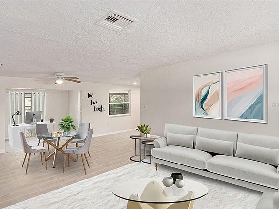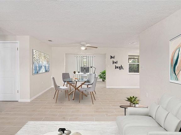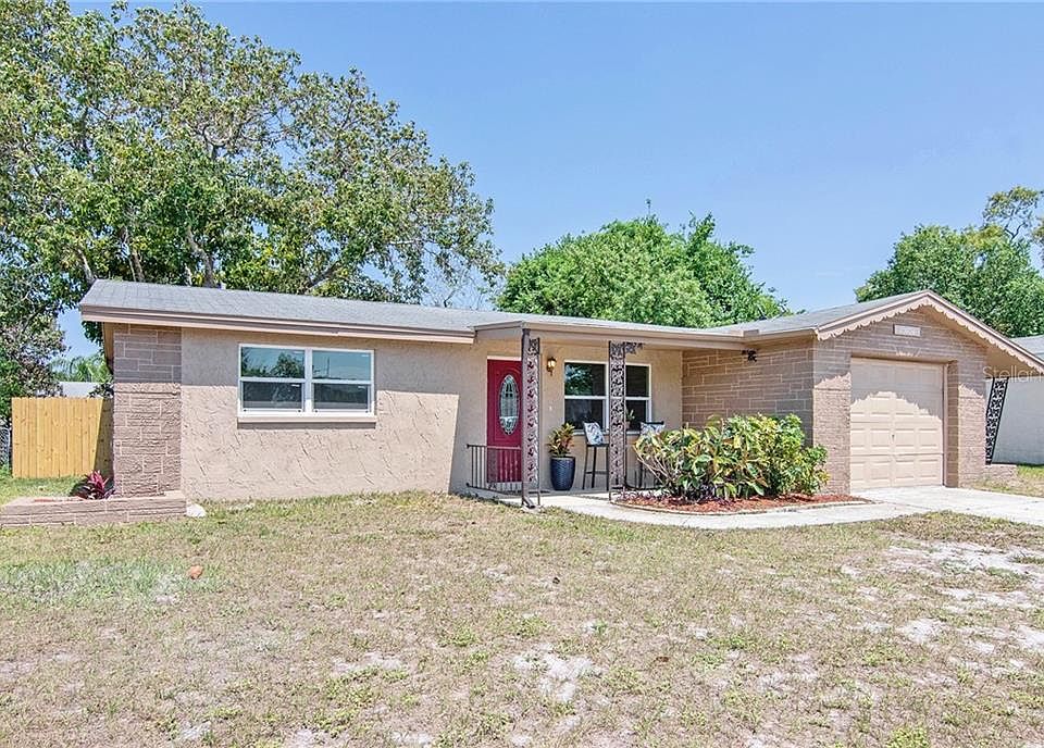 One or more photo(s) has been virtually staged. Tastefully remodeled and awaiting new owners! Foyer welcomes you into the bright and airy living room with adjoining dining area. Kitchen features white shaker cabinetry, granite work surfaces, stainless appliances and overlooks the covered + screened lanai. Flex space off the dining room makes a great office or den including lanai entry. The back yard is fully fenced and you have ample space for a garden, playset, etc. Master bedroom with en suite bath offer yard access as well. Guest bedroom shares the full hall bath with a shower, tub and updated fixtures. Tile plank flooring throughout. The expansive 1-car garage also has washer / driver hookups with workspace around this nook if additional storage organization is your goal... Conveniently located just east of US-19 and the Gulf is close by too! A must see in the community with no HOA, call to schedule a visit!