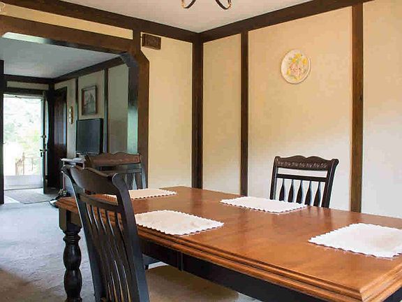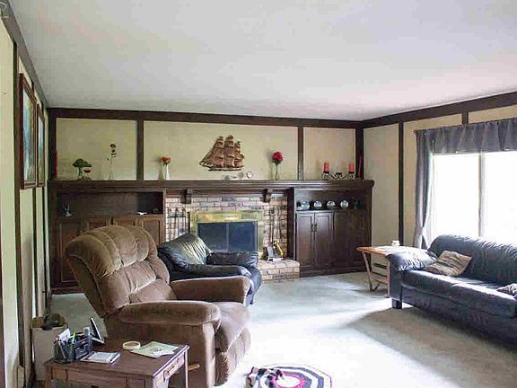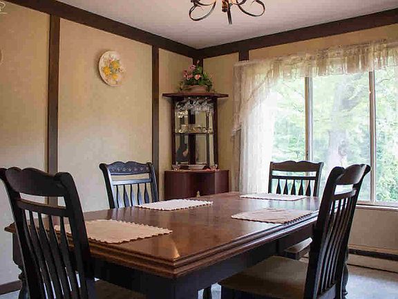 Charming ranch on 5 acres, with 30x40 pole barn with 10 ft ceilings!! Set back from the road, this 3 bedroom home has a large living room with built-in book case and a fireplace, first floor laundry, 1.5 baths including a charmer with a clawfoot tub and vintage vanity, large kitchen, formal dining room, and full basement with daylight windows, rec area, and a room that could be used as a 4th bedroom. Multi-level deck off of the back of the house overlooks the private pond. One year home warranty included!!
