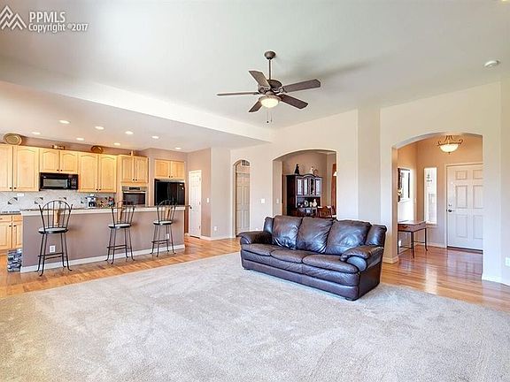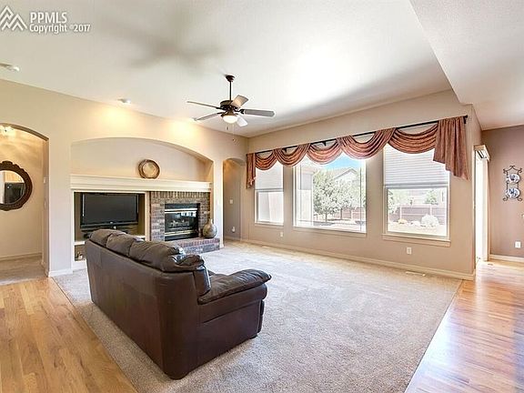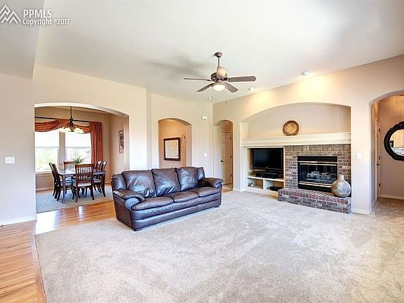 Popular ranch style floor plan in immaculate condition in Pine Creek. Open & Bright flowing floor plan. The gourmet kitchen overlooking the great room features granite slab counter-tops, hardwood flooring, and new stainless steel appliances. 9 ceilings and arched entry ways on the main level. Separate formal dining room with hardwood flooring & crown molding. Master Bedroom has an adjoining 5 piece master bath & walk-in closet. The main level has two additional bedrooms or the 3rd bedroom can be used as an office.,Original owners! Move in ready! Recent upgrades include: new roof (5/17),backyard landscaping (5/17),water heater (1/17),stainless steel appliances (excluding refrigerator (6/17) . The sprinkler system, furnace, central air garage door, fire-place, dryer vent were all just serviced and repaired as necessary. Interior & exterior windows just professionally cleaned. There is a partial finished basement with a recreational room,a full bath,3rd bedroom with a walk-in closet which is ideal for guests. The basement also has a large utility room that offers plenty of storage space. Professionally landscaped yard with a partially covered patio and fenced backyard. Two step entry from the garage and out to the back patio. There is a garage access door to the back yard. South facing front. Great location in Pine Creek. Quick access to SD 20 schools, shopping, & all military bases. To see why the Pine Creek neighborhood is such a desirable place to live, please go to PCVA.org. Owner/agent