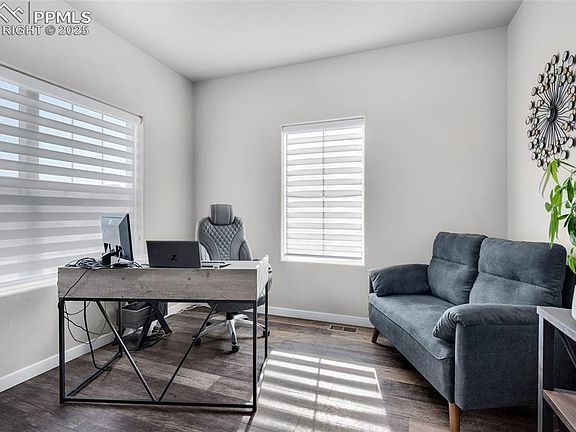 This stunning home offers breathtaking views of Pikes Peak and is located in a peaceful neighborhood with no HOA restrictions. Designed with sustainability and efficiency in mind, the home features fully paid solar panels, providing significant savings on energy costs—an incredible perk for years to come! The Xeriscaped front yard ensures low-maintenance living. Step inside to a bright and airy open floor plan, where a family room with panoramic views and a gas fireplace flows seamlessly into the dining area—perfect for hosting and everyday living. The chef’s kitchen boasts granite countertops, stainless steel appliances, and a spacious pantry, with a mudroom leading to an oversized, heated 3 car garage. Designed for versatility, the garage accommodates large trucks with ease and includes a 240-volt outlet for EV charging. The main floor also features a stylish home office and a convenient half bathroom. Upstairs, you'll find a spacious loft and four bedrooms, each with walk-in closets. The luxurious primary suite is a true retreat, complete with spectacular mountain views, a spa-like five-piece ensuite bathroom, and a walk-in closet with an upgraded closet system. The basement offers endless possibilities, featuring durable LVP flooring, a second laundry area, and a kitchenette ideal for light cooking. Whether you're hosting guests, exploring multi-generational living, or considering rental potential, this space has its own access to the backyard, ensuring privacy and convenience. The backyard oasis includes a spacious deck for summer BBQs, a sanded play area, a storage shed, and a large, fenced yard perfect for activities. For some fun throughout the year, the property features Jellyfish permanent lighting. Located near schools, stores, and the Woodmen Hills Metro District rec. center (membership opt.), this home effortlessly blends style, comfort, and practicality. Don’t miss your opportunity to make this energy-efficient, thoughtfully designed property yours!